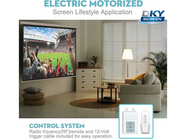 DkyScreen DM30 model 300x225cm Elektrikli Motorlu Projeksiyon Perdesi, yüksek kazançlı mat beyaz özel perde kumaşı ile üstün görüntü kalitesi sunar. Bu özellik, eğitim kurumları, ofis ortamları ve sinema izlemek için ev sinema odası projelerinde idealdir.